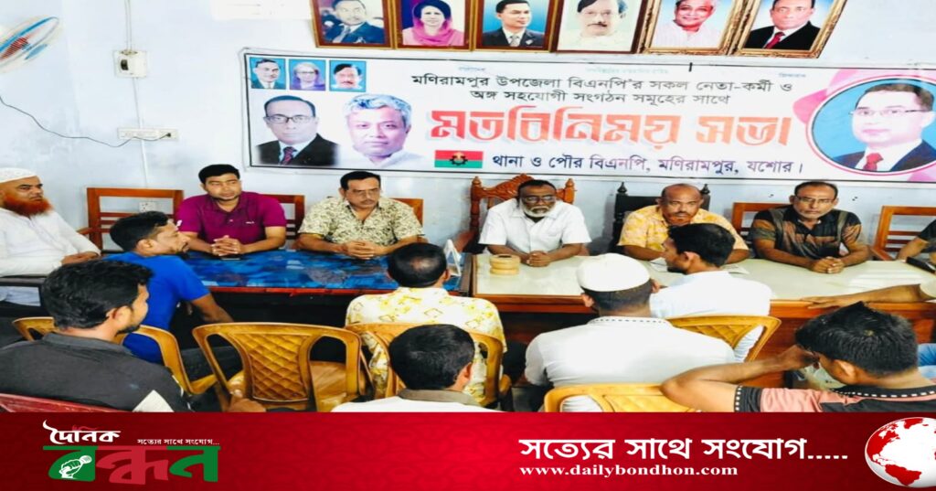 মণিরামপুর উপজেলা বিএনপির কার্যালয়ে বৃহঃবার ১৪ আগষ্ঠ বেলা ১২টাই আয়োজিত মতবিনিময় সভার সভাপতিত্ব করেন পৌর বিএনপির সভাপতি মোঃ খায়রুল ইসলাম।